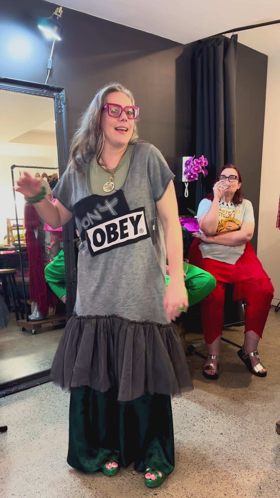 The DON'T OBEY Dress began as a long T-shirt with a deliberately distressed finish — intentional, raw, and graphic — and was reworked into a powerful street-driven statement dress with an asymmetrical tulle ruffle finishing the hem.