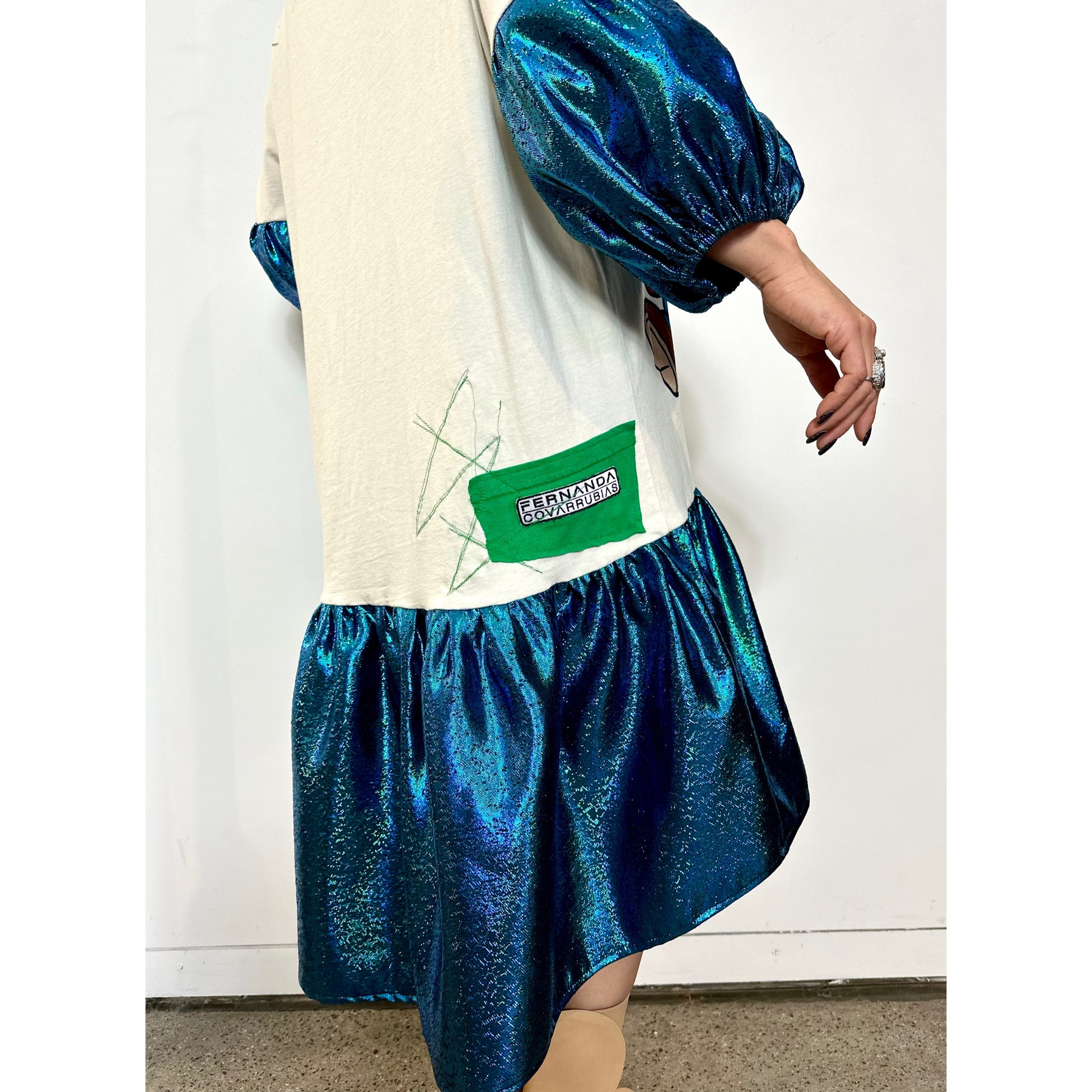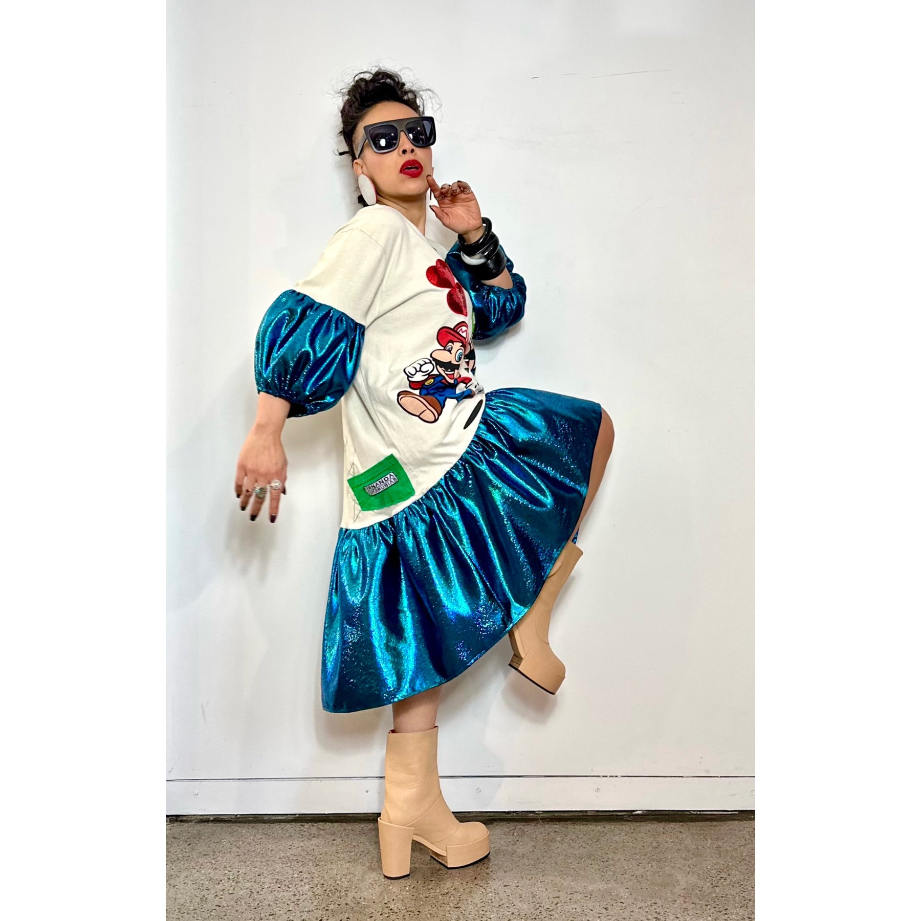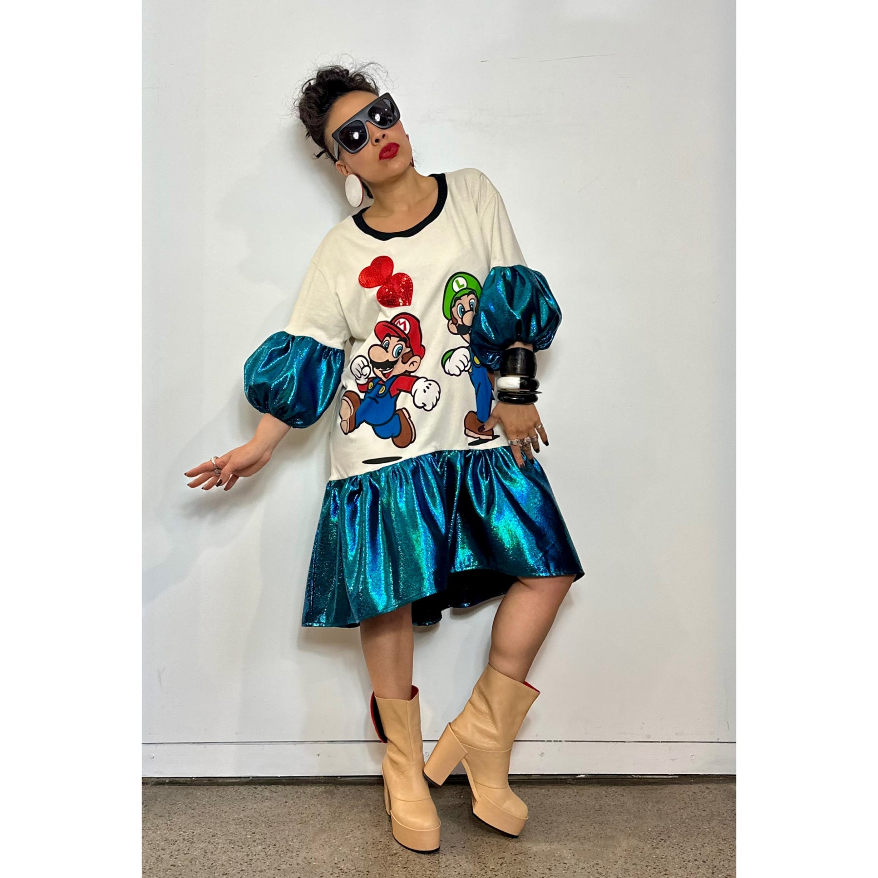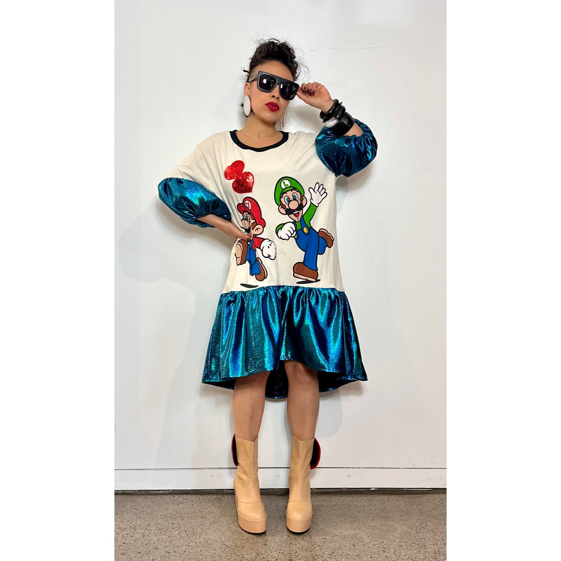 The Mario & Luigi Dress began as a cream upcycled T-shirt featuring a bold, colourful Mario & Luigi print at the front — playful, nostalgic, and full of character — and was transformed into an oversized, street-driven statement dress with sculptural shape and attitude.
