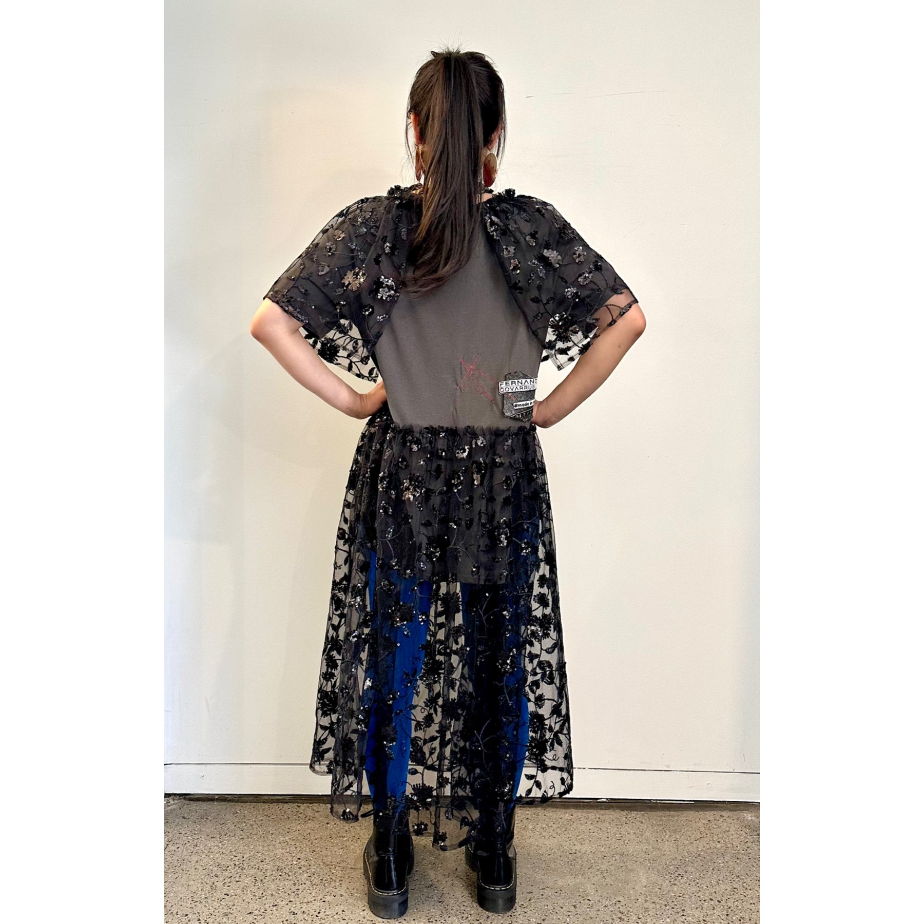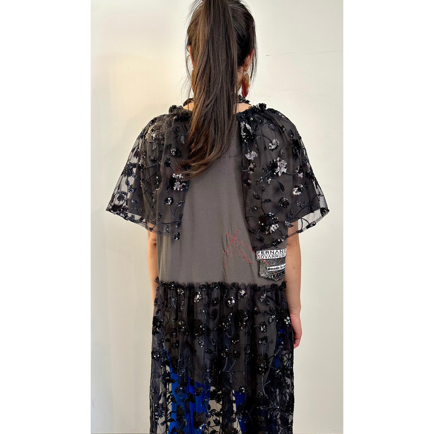 The silhouette is reworked into a long dress with an empire-style skirt, crafted from black sequined tulle that catches the light with every movement. Cap-style ruffled sleeves, made from the same sequined tulle, frame the shoulders and add volume, drama, and attitude. The result is bold and theatrical — playful at the top, powerful through the body — designed to stand out without trying to be polished.