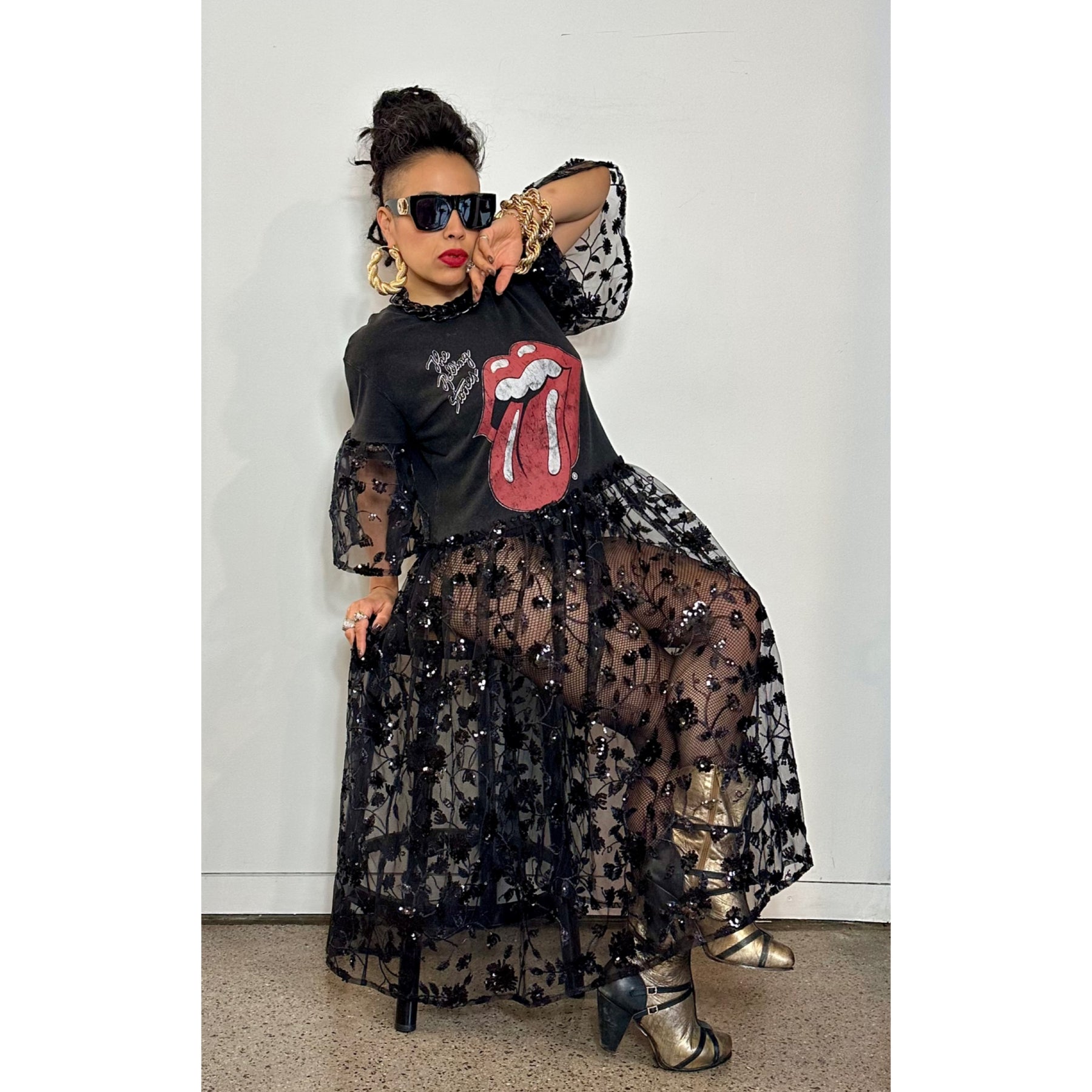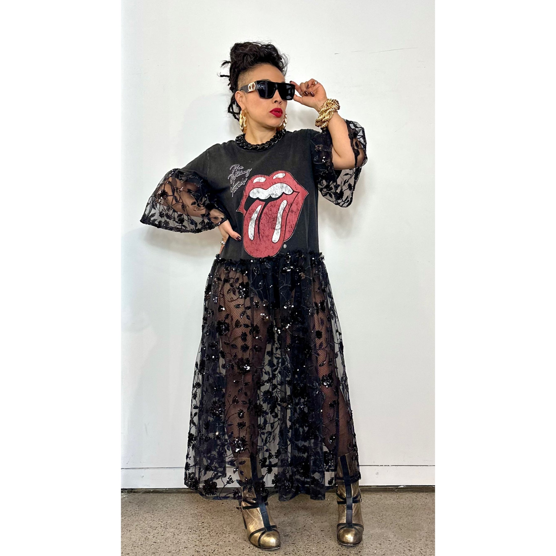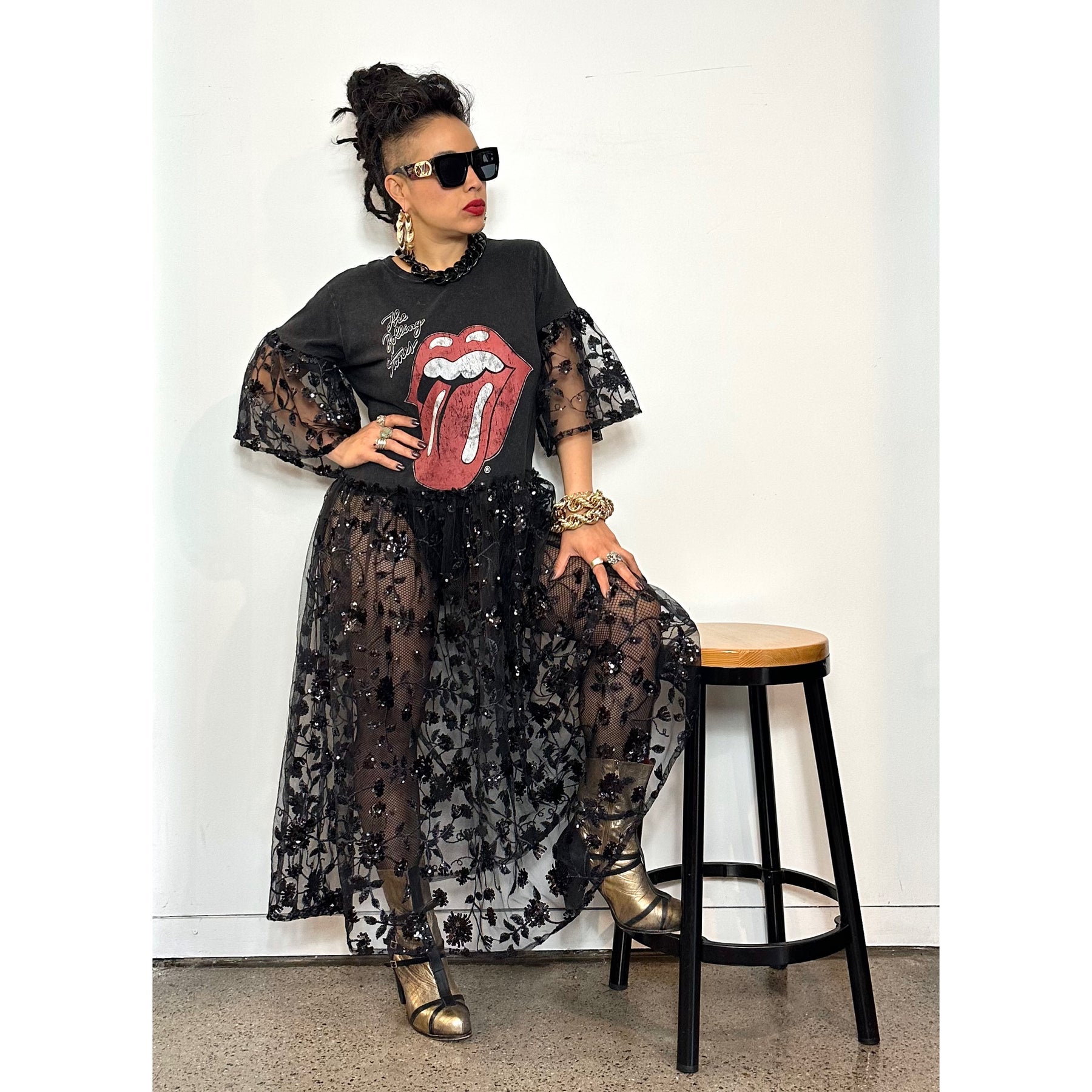 The Rolling Stones Dress began as an upcycled tee — the kind with attitude baked into its threads — and was transformed into a statement dress wrapped in layers of sheer, black sequined tulle.
