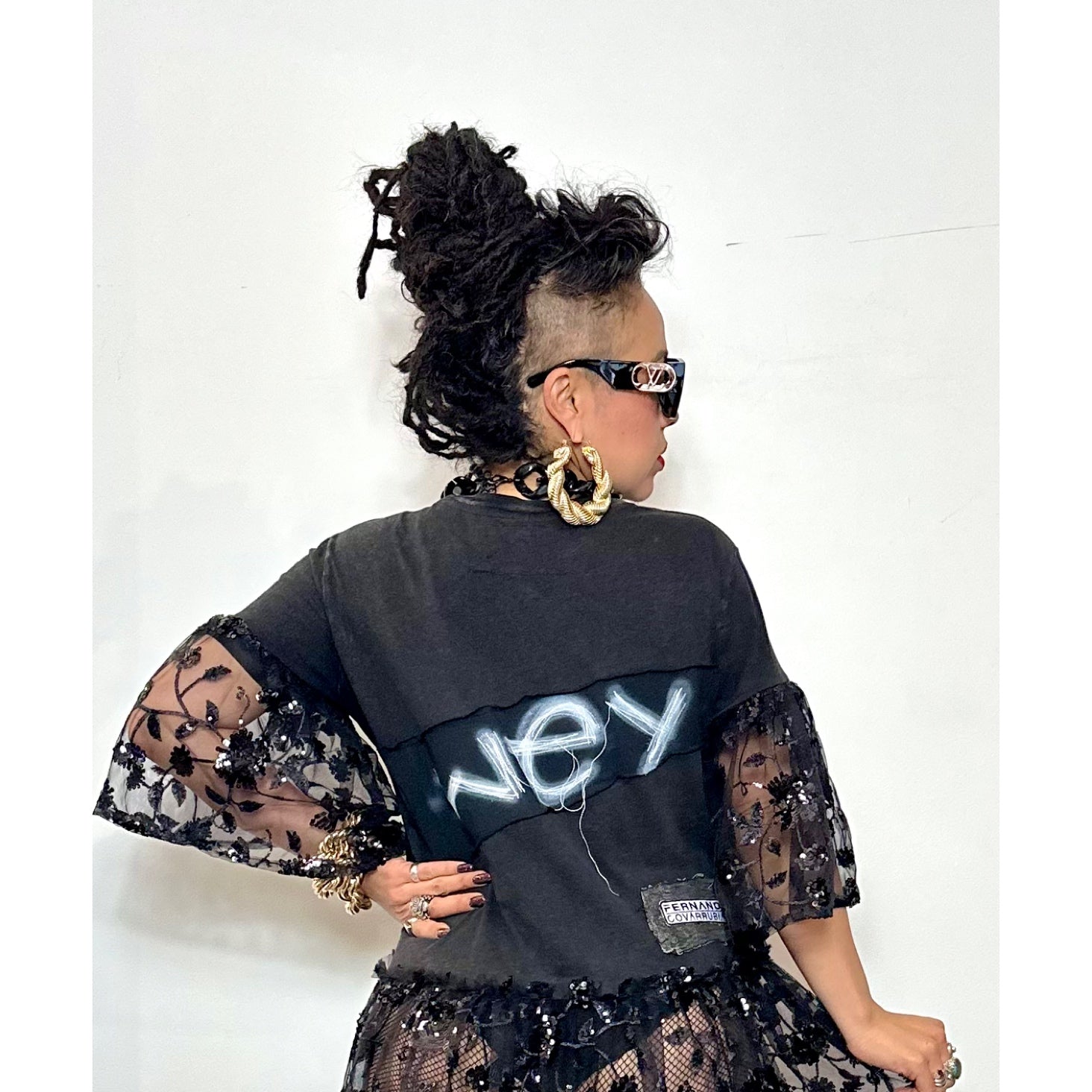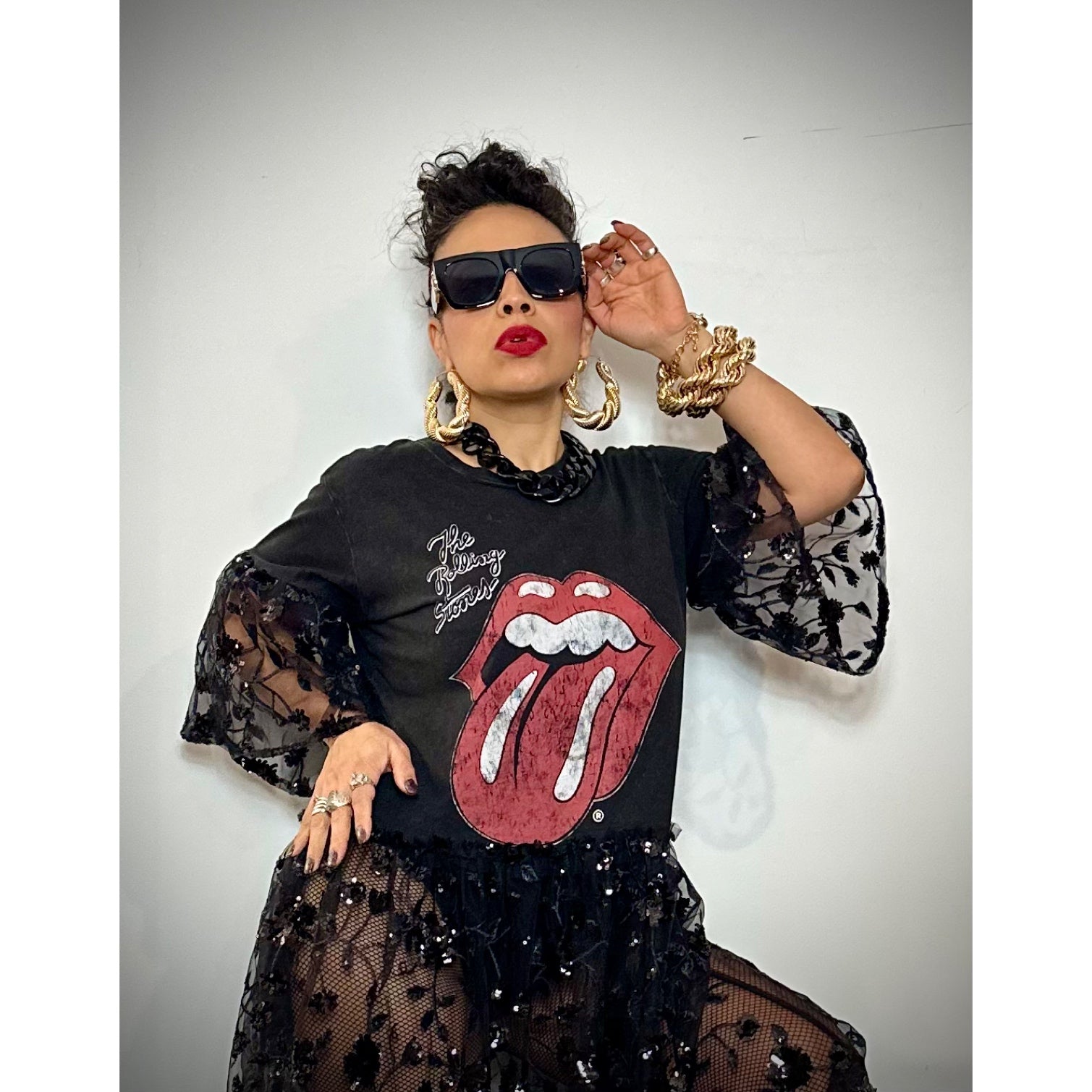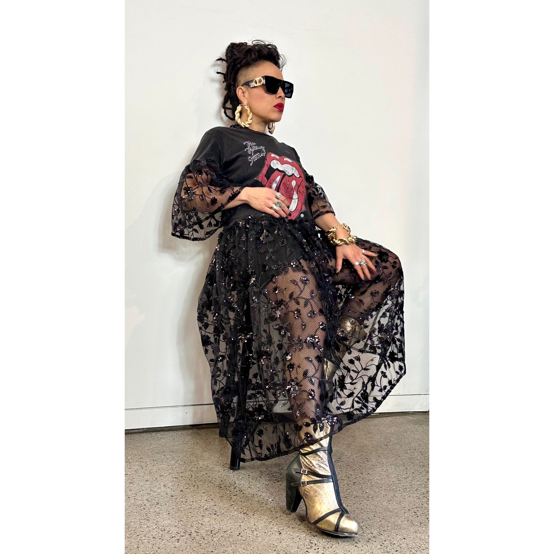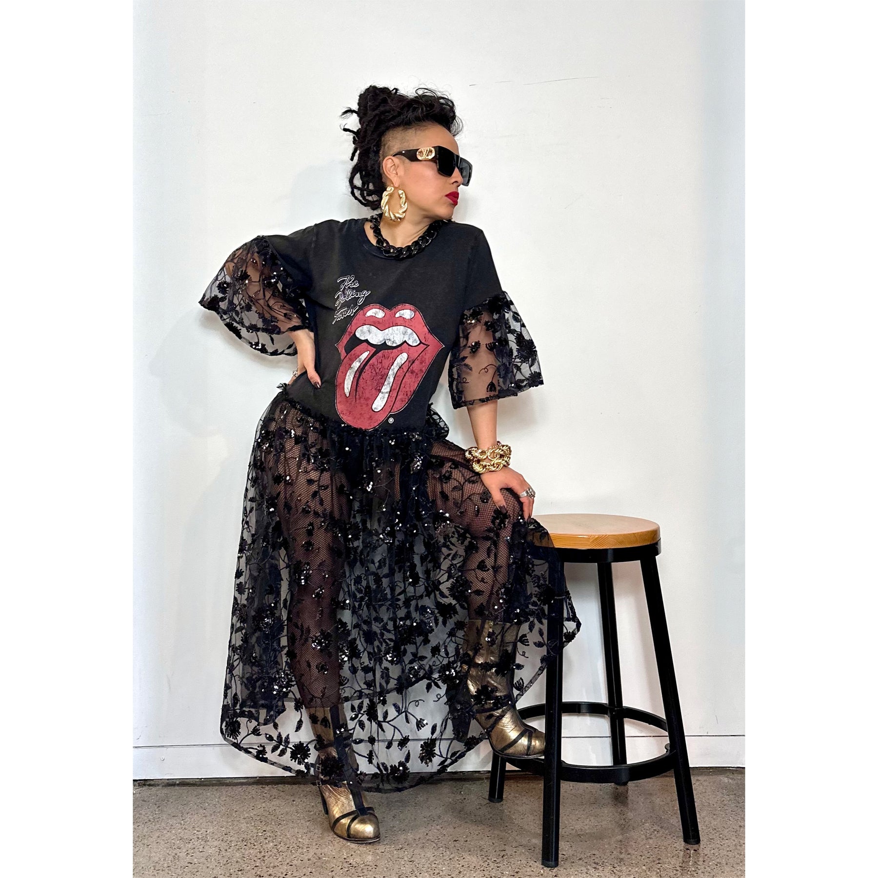 The Rolling Stones Dress began as an upcycled tee — the kind with attitude baked into its threads — and was transformed into a statement dress wrapped in layers of sheer, black sequined tulle.