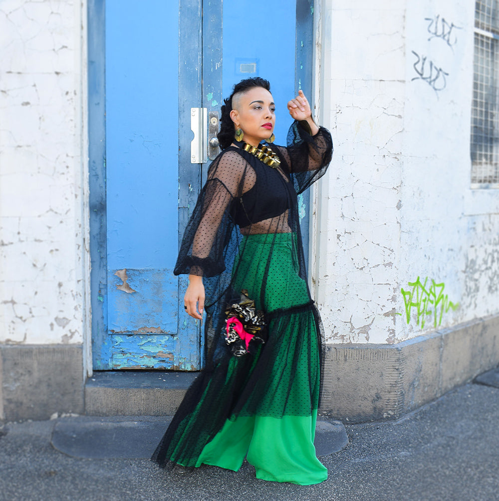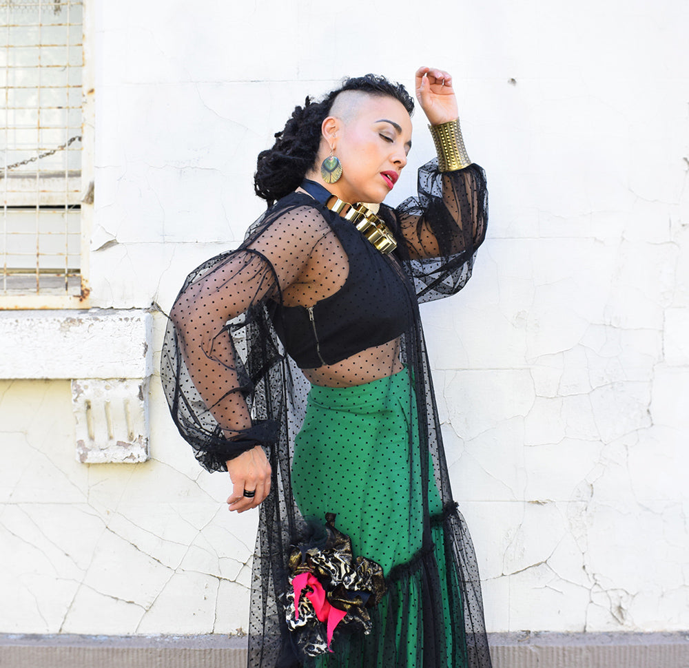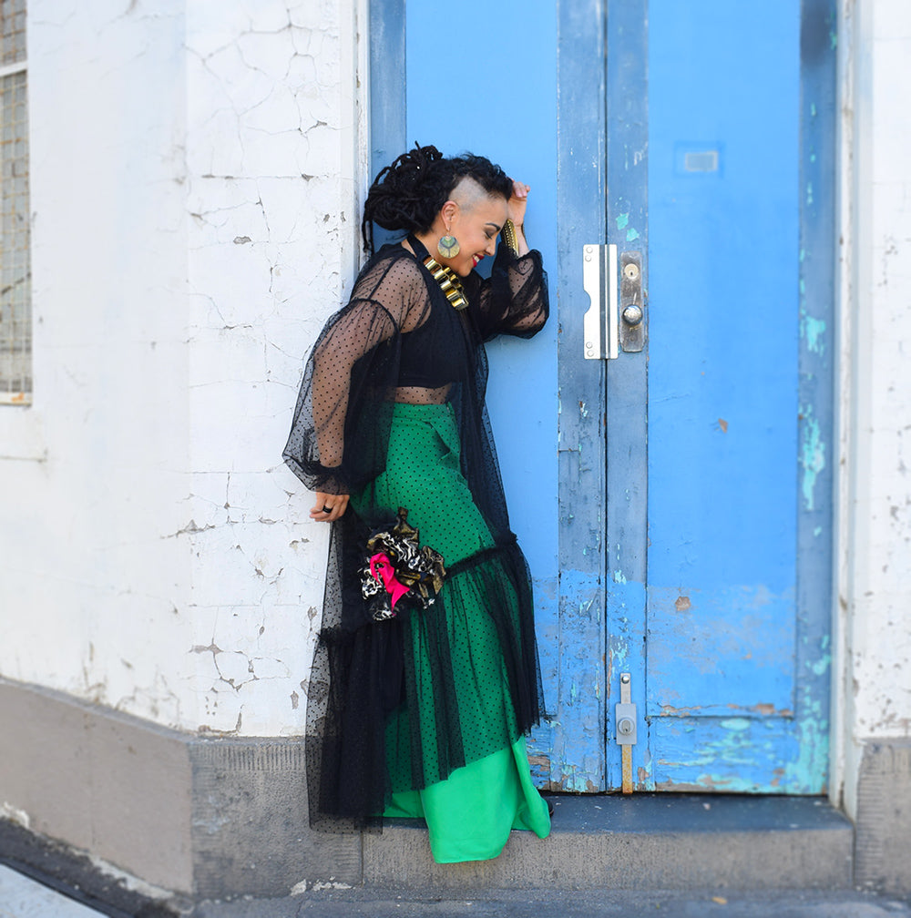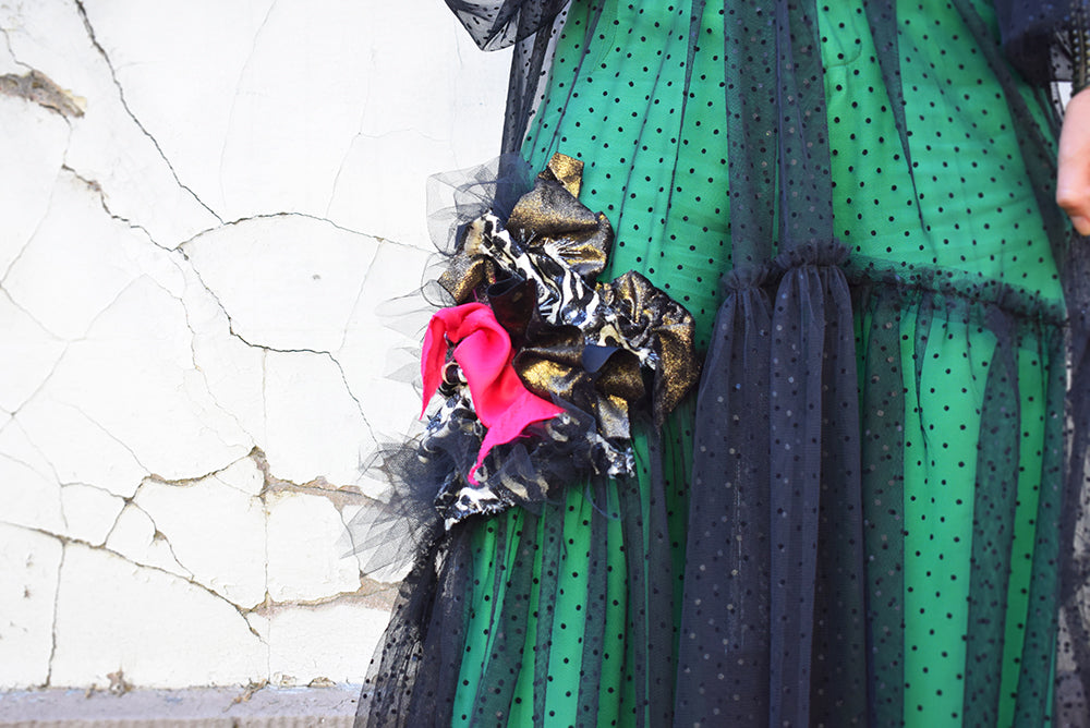 Our Treasure dress is classy, and flattering on any body shape, It features a unique upcycled embellishment, which is the perfect example of Fernanda's singular upcycling techniques.