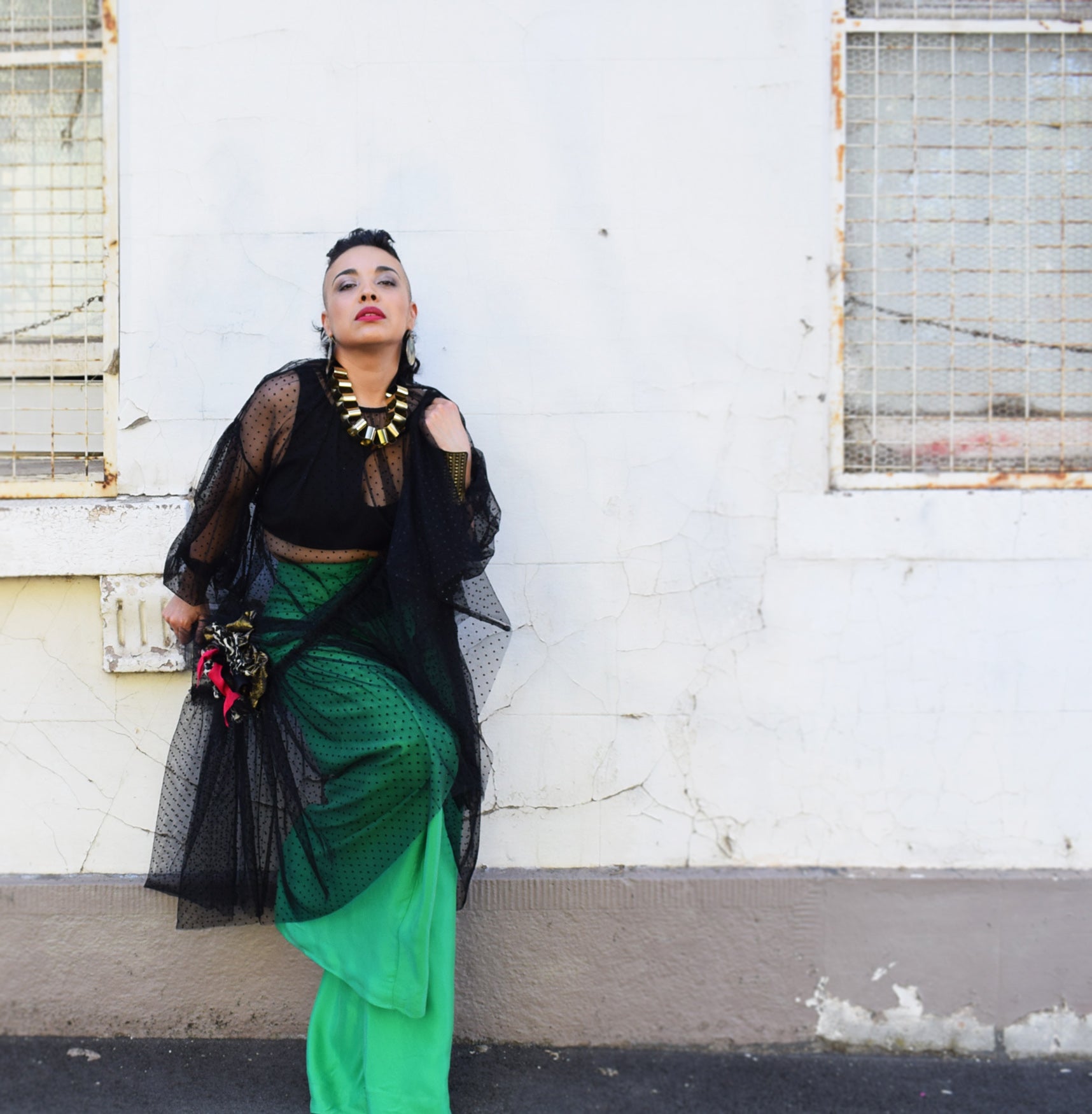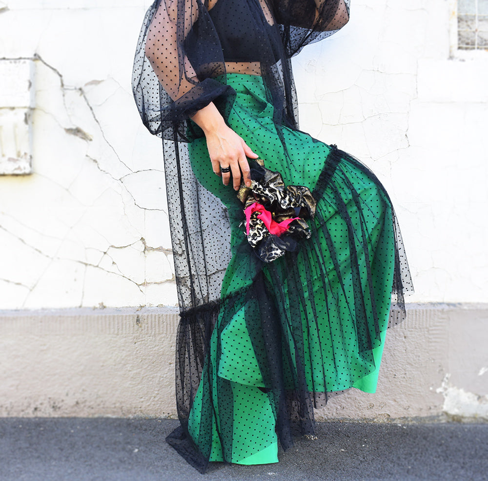 Dress: Tulle (100% polyester) with tiny velvet dots.